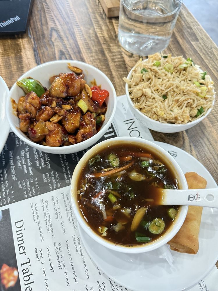 Chicken, orange juice, orange peel, ginger, tangy. Lunch Specials served with Veg Spring Roll and Soup of the Day. Includes choice of rice: steamed white/veg/chicken fried rice. Add veg/chicken hakka noodles (extra charge). Add naan/malaysian paratha (extra charge).