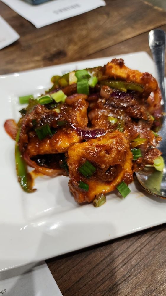 Chicken, caramelized red onion, crispy rice noodle.Lunch Specials served with Veg Spring Roll and Soup of the Day. Includes choice of rice: steamed white/veg/chicken fried rice. Add veg/chicken hakka noodles (extra charge). Add naan/malaysian paratha (extra charge).