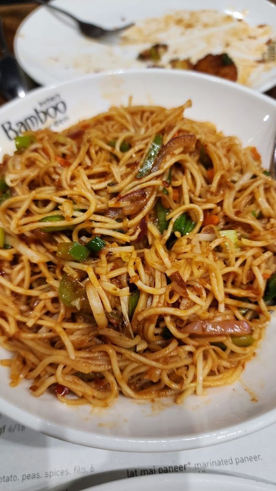 Spicy. Thin eggless noodle, shredded vegetables, green chili sauce. Choose Veg (vegan), Chicken, Shrimp, or Mixed (chicken/lamb/shrimp).