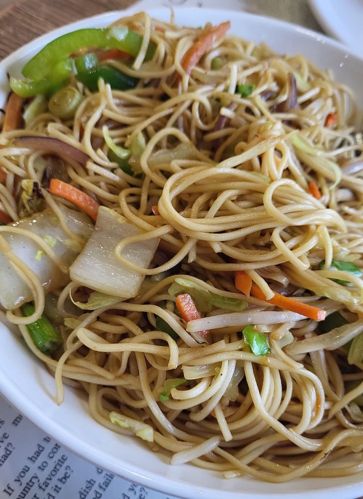 Thin eggless noodle , shredded vegetables, Napa, celery. Choose Veg (vegan), Chicken, Shrimp, or Mixed (chicken/lamb/shrimp).